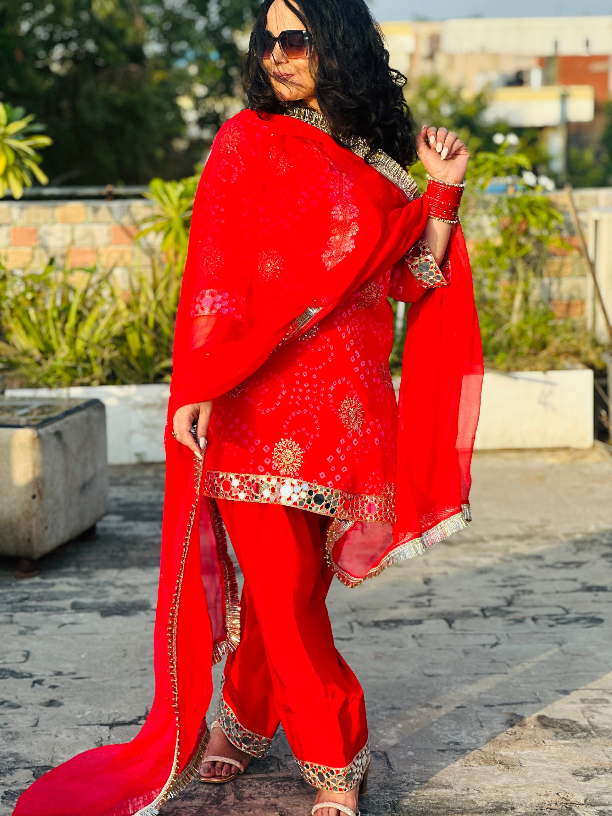 Turn heads in this bright red suit that blends tradition with modern glam. The mirror border and golden accents bring a festive sparkle, while the comfortable silhouette keeps it effortlessly stylish. And the style is fulfilled by the grace of Farshi salwar.