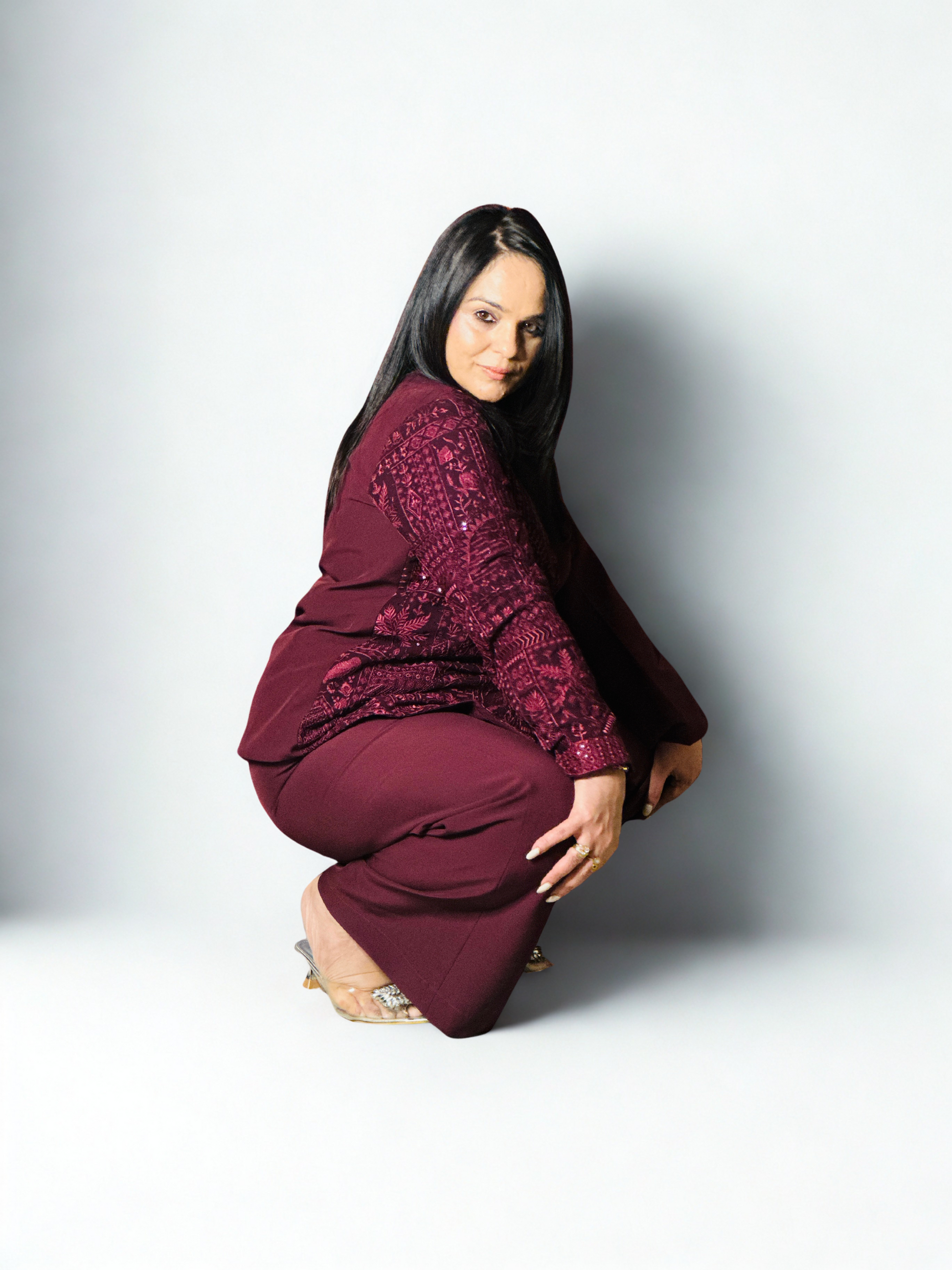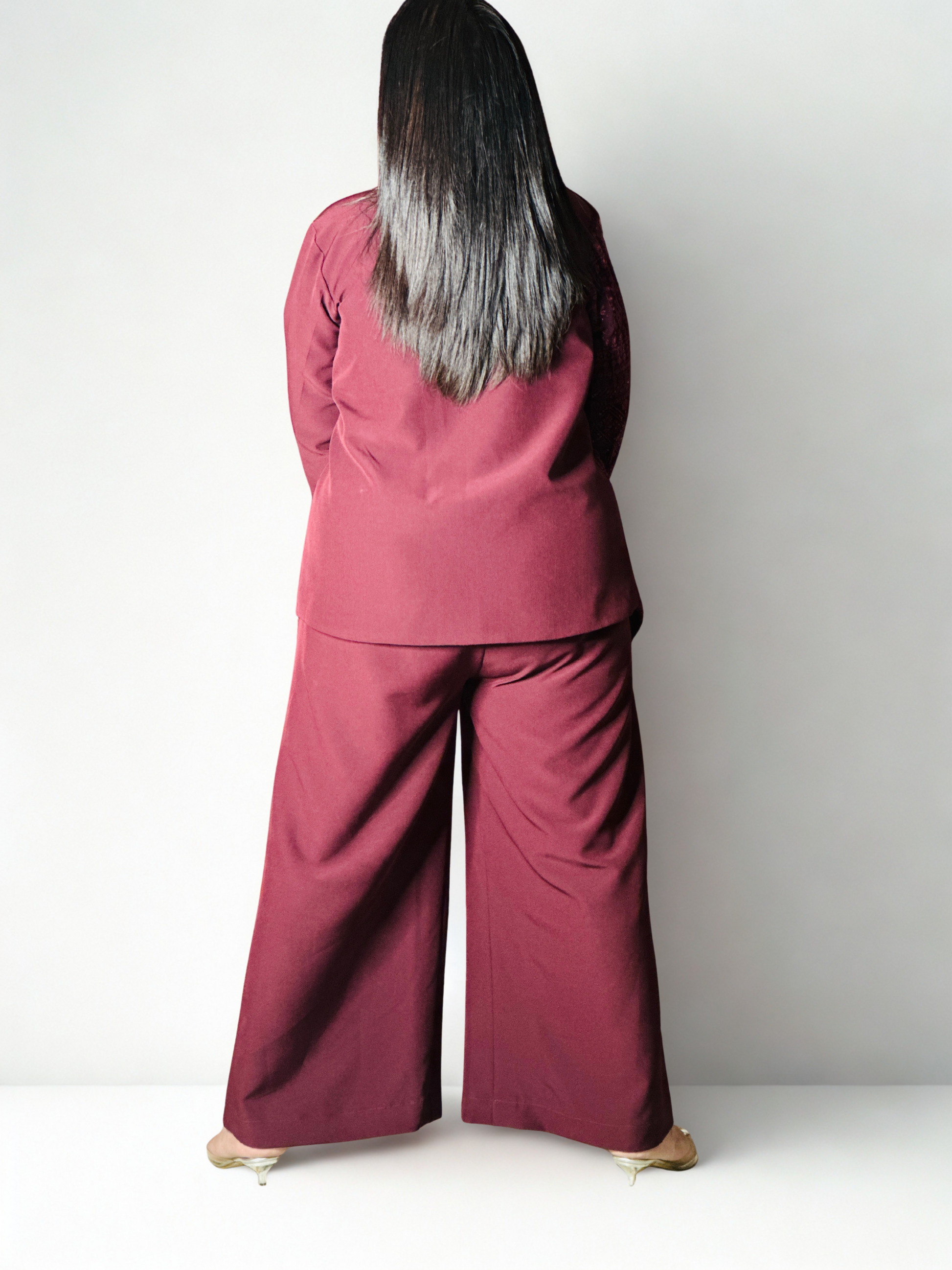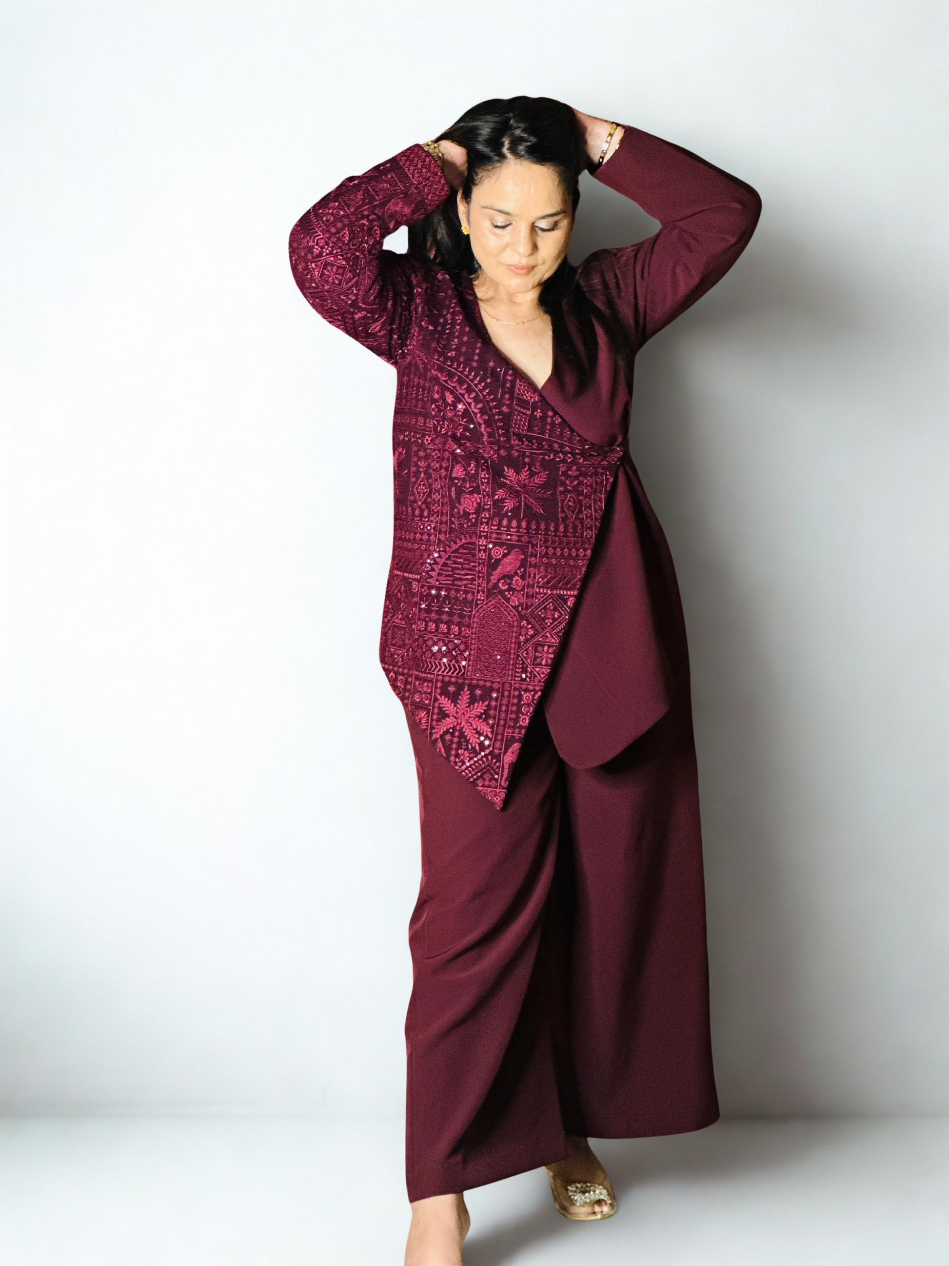 This ensemble exudes timeless elegance with its deep wine hue and contemporary silhouette. The asymmetric blazer features intricate embroidered detailing, creating a rich texture that beautifully complements the solid flowy palazzo pants. Designed for both comfort and sophistication, the outfit strikes the perfect balance between traditional charm and modern styling. Ideal for festive gatherings, evening soirées, or formal occasions, this piece embodies refined grace while making a confident statement.