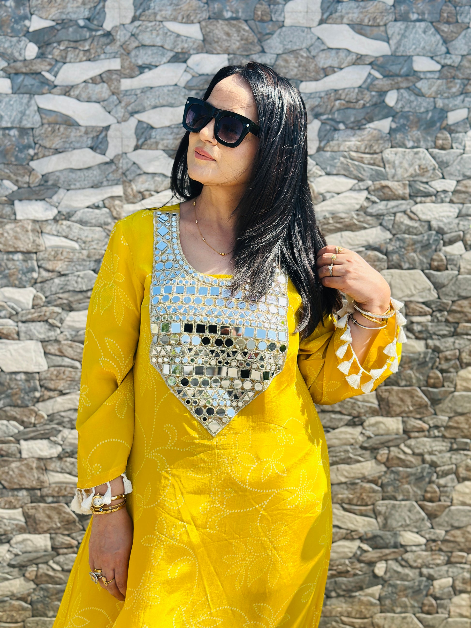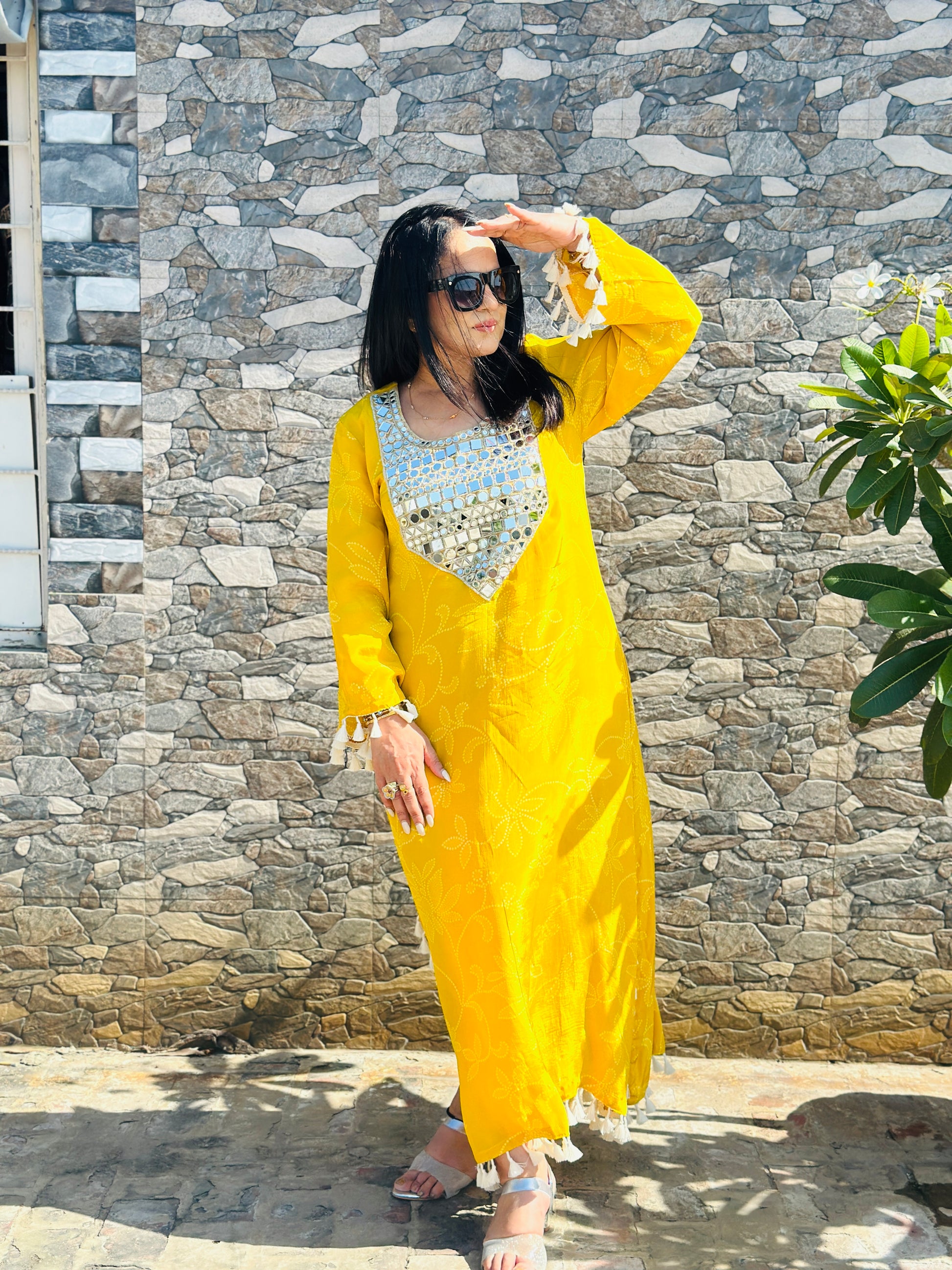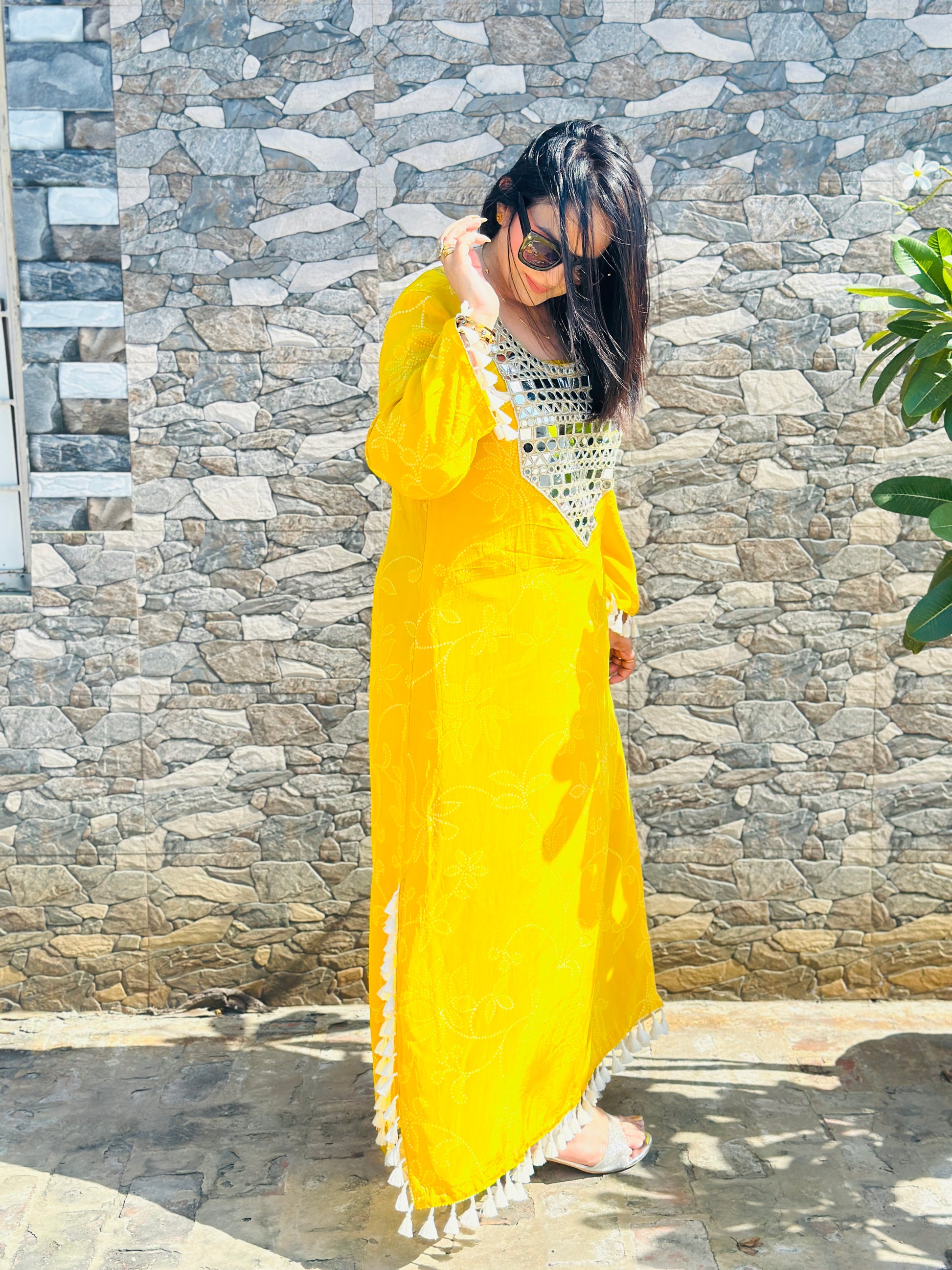 Whether you want to turn heads at a festive brunch, radiate charm at a mehendi function, or simply embrace your love for bold, bright colors, this yellow tassel kurta dress is all about spreading joy, confidence, and effortless grace.
